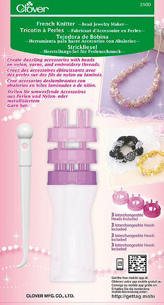 Clover recently introduced the French Knitter for creating beaded jewelry. It is reminiscent of the spool knitters many of us made and used as children. However, it features interchangeable heads with 4, 5 or 6 pegs and a curved base for comfortable handling. An amazing variety can be achieved using yarns, ribbon, thread, leather cord, twine and embroidery floss with beads of different sizes.